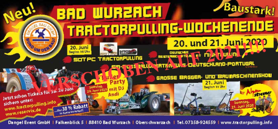 Dangel Event GmbH präsentiert, das erste Mal im Falkenblick in Bad Wurzach, das einzigartige Tractor Pulling "Deutscher Meisterschaftslauf" mit Nightpulling Show, mit dem Süddeutscher Tractor Pulling Club e. V. aus Holzheim.